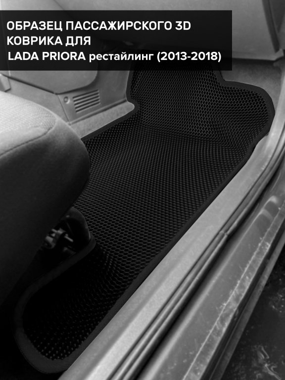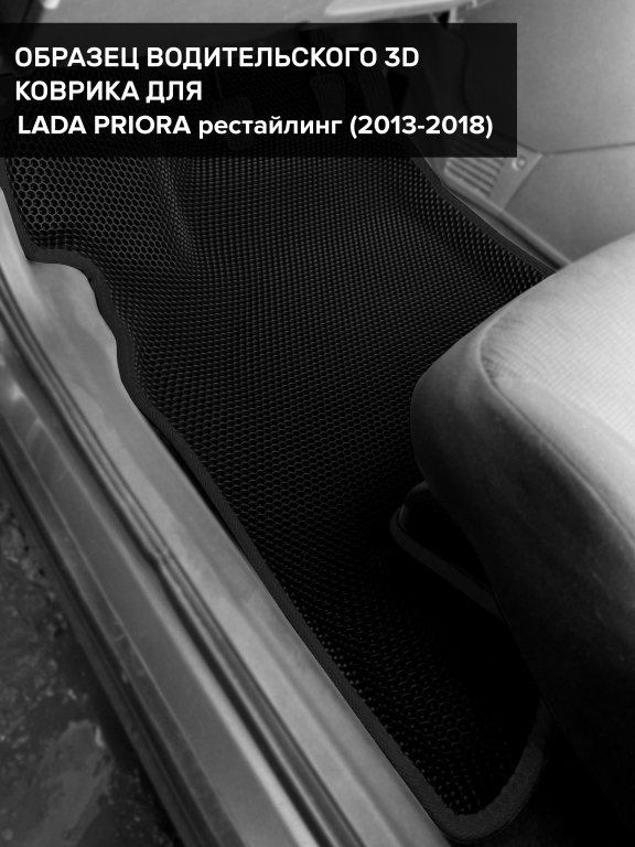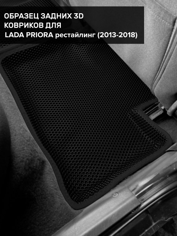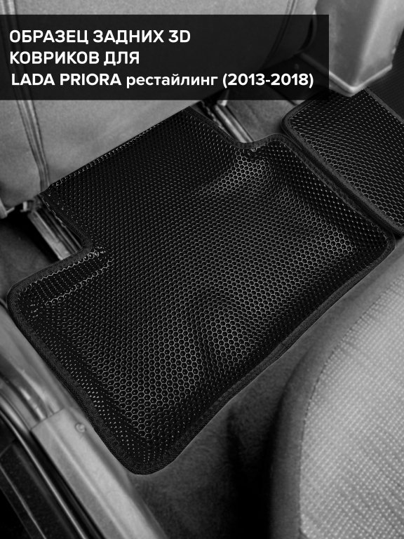 Автомобильные 3д коврики для Lada Priora рестайлинг (2013-2018) в салон авто и багажник сделаны из инновационного полимерного материала EVA, изысканная структура в виде ячеек не дает воде, пыли и снегу разлетаться по салону машины и багажнику. 3д коврики зафиксированы на полу определенными клипсами, соответствующими Lada Priora рестайлинг (2013-2018), и не двигаются в процессе езды.