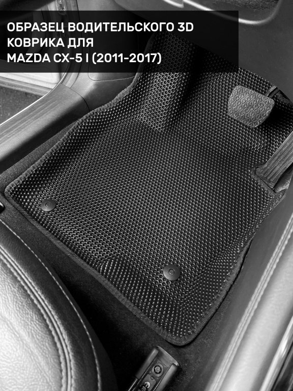 Автомобильные 3д коврики для Mazda CX-5 I (2011-2017) в салон авто и багажник сделаны из инновационного полимерного материала EVA, изысканная структура в виде ячеек не дает воде, пыли и снегу разлетаться по салону машины и багажнику. 3д коврики зафиксированы на полу определенными клипсами, соответствующими Mazda CX-5 I (2011-2017), и не двигаются в процессе езды.