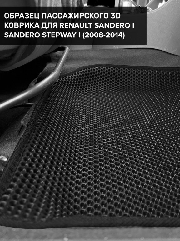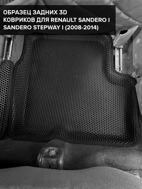 Автомобильные 3д коврики для Renault Sandero Stepway I (2010-2014) в салон авто и багажник сделаны из инновационного полимерного материала EVA, изысканная структура в виде ячеек не дает воде, пыли и снегу разлетаться по салону машины и багажнику. 3д коврики зафиксированы на полу определенными клипсами, соответствующими Renault Sandero Stepway I (2010-2014), и не двигаются в процессе езды.